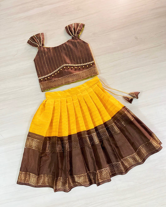 Mango Yellow And Brown Double Border Traditional Lehenga Set