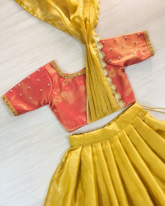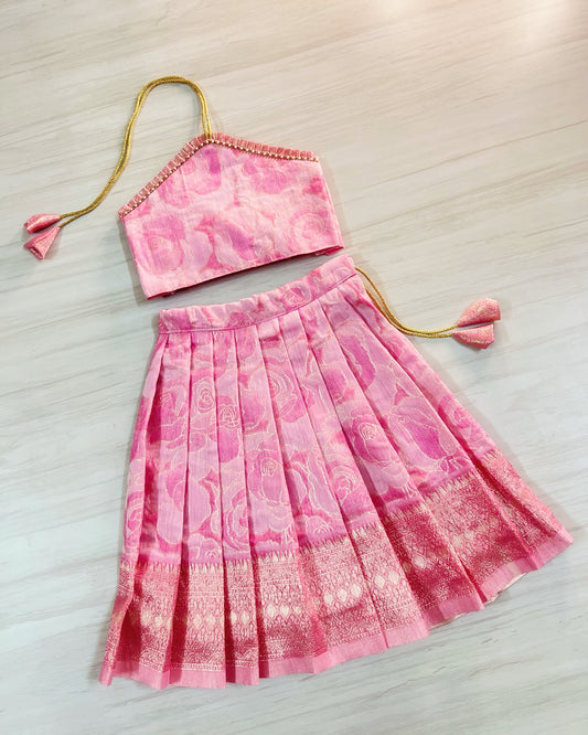 Flamingo Pink With Glowing Gold Half Saree Style Silk Lehenga Set | The Silkberry