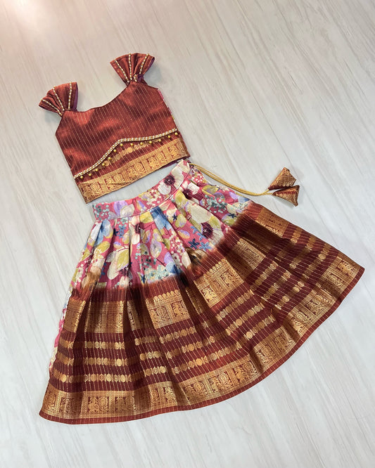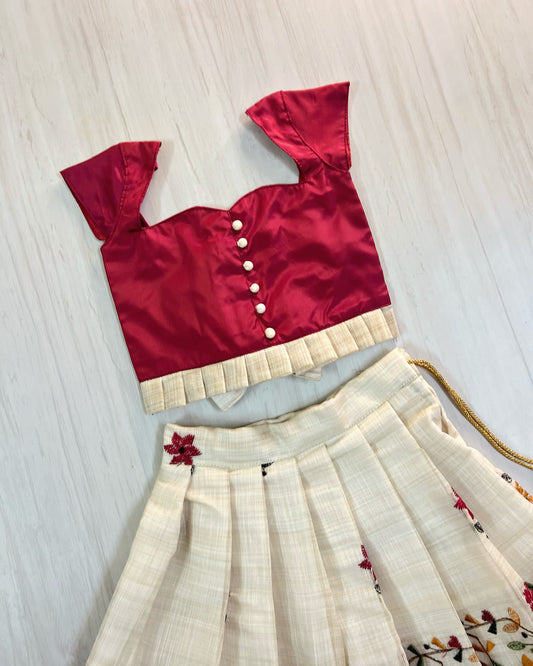 Burgundy Tulip Design Top With Pure Cotton Skirt Lehenga Set | The Silkberry