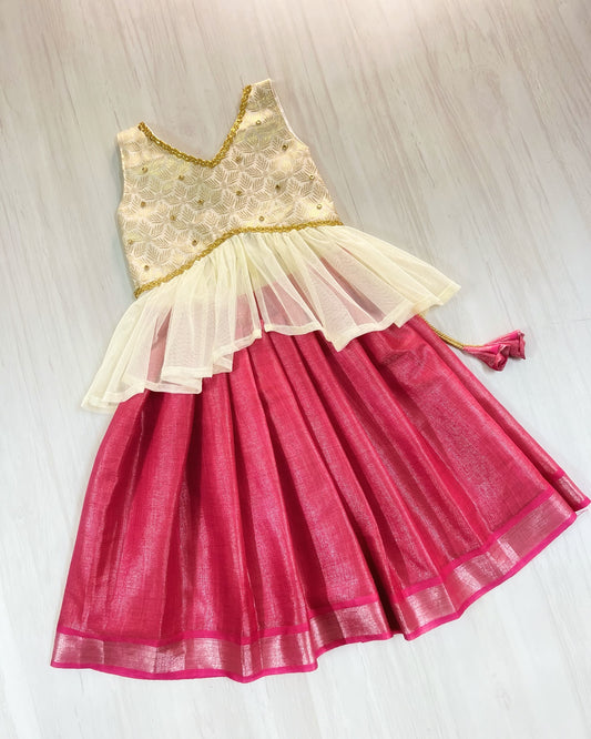 Shimmery Pink Cute Bow Style Silk Top With Premium White Cotton Skirt
