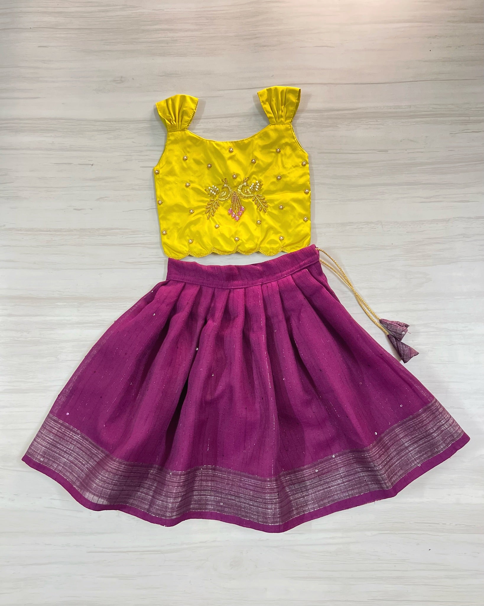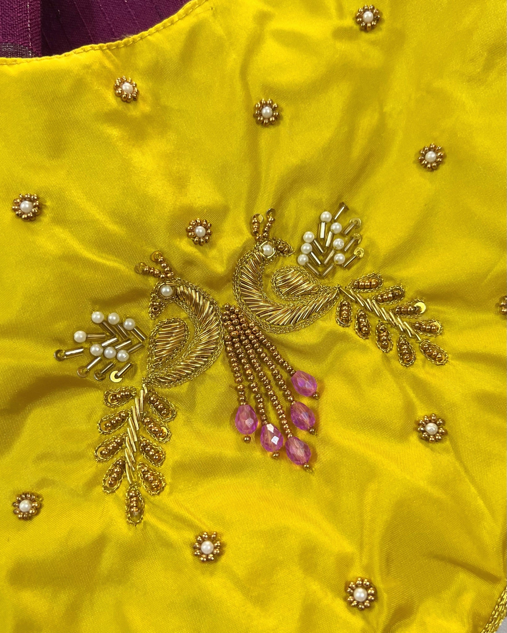 Saffron Yellow Peacock Embroidered Aari Work Cute Top With Plum Lehenga Set | The Silkberry